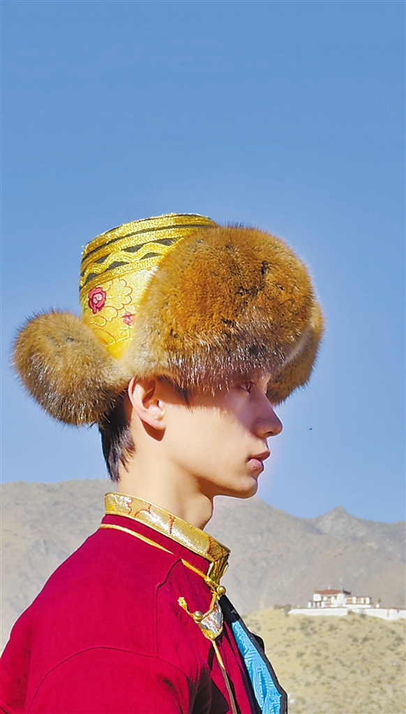 “朗霞”藏語意為氆氌帽,是墨竹工卡縣女性服飾的重要組成部分。這種帽子以黑色氆氌做底,兩側鑲有花邊,后面翹有兩個角,實用又美觀,成為女性展示自身魅力的重要配飾。帽子的裝飾因年齡和身份的不同而有所差異,年輕女孩戴的帽子裝飾較多,花紋圖案豐富,頂上為八瓣花,代表著吉祥八寶(傳統圖案)的數量;成年女性的帽子則少些花俏,更為沉穩(wěn);老年婦人的帽子則簡潔大方,透露出歲月的積淀與智慧;而僧尼的帽子則為絳紅色,彰顯著她們的宗教身份與信仰。