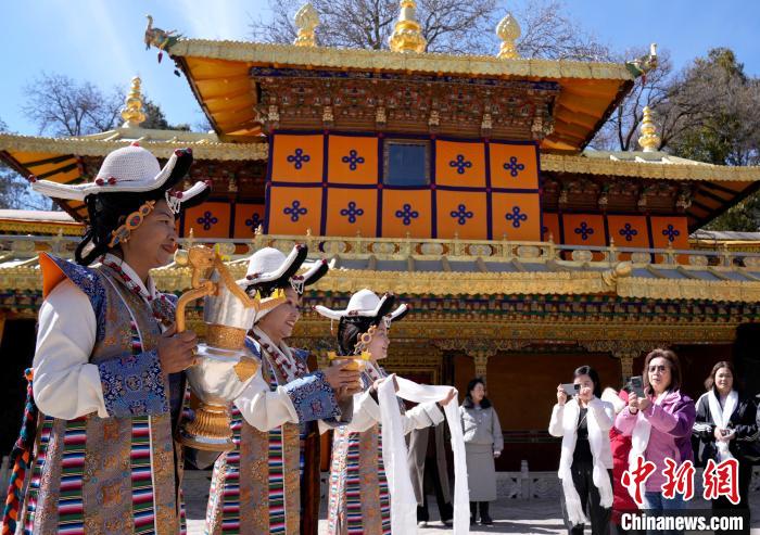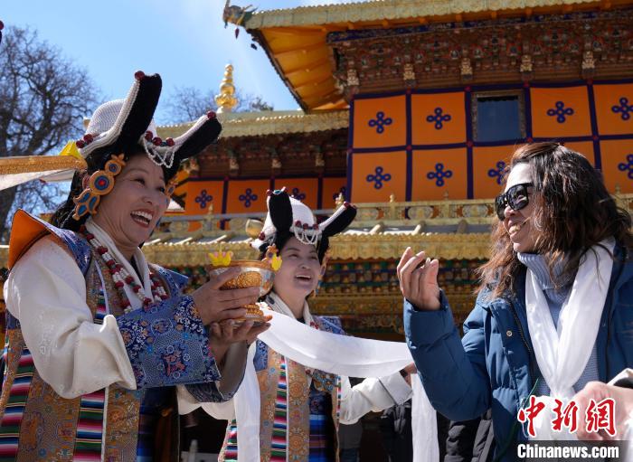 2月20日,由西藏自治區(qū)文化和旅游廳舉辦的2025年香港至拉薩航班首航旅行團歡迎儀式在羅布林卡舉行。來自香港的游客將前往布達拉宮、大昭寺等地,開啟冬游西藏旅途。2月19日,拉薩至香港的首條地區(qū)航線正式開通。航線的開通,更加便捷了兩地居民的出行,也將進一步促進兩地在旅游、文化、經(jīng)貿(mào)等領域的交流與合作。圖為歡迎儀式現(xiàn)場,工作人員向香港游客敬獻青稞酒。中新社記者 李林 攝