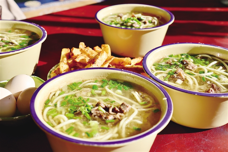 在西藏,人們總能將簡單的食材做出獨(dú)一無二的“西藏味道”。一壺甜茶,一碗藏面,一份炸土豆或肉餅,便是這里最標(biāo)準(zhǔn)的早餐套餐。清水、紅茶茶葉、甜奶粉或牦牛奶,只需簡單的食材,便能制作出茶香濃郁、奶味醇厚的甜茶。在略帶寒意的初春,喝上一口,整個身子都暖了起來。此時搭配一碗筋道的藏面,簡單又滿足。