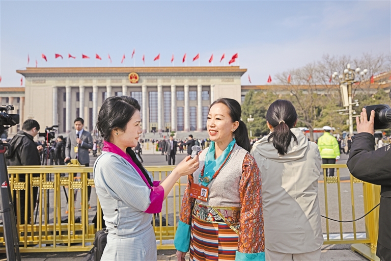 全國(guó)人大代表格桑卓瑪(右)接受媒體采訪。