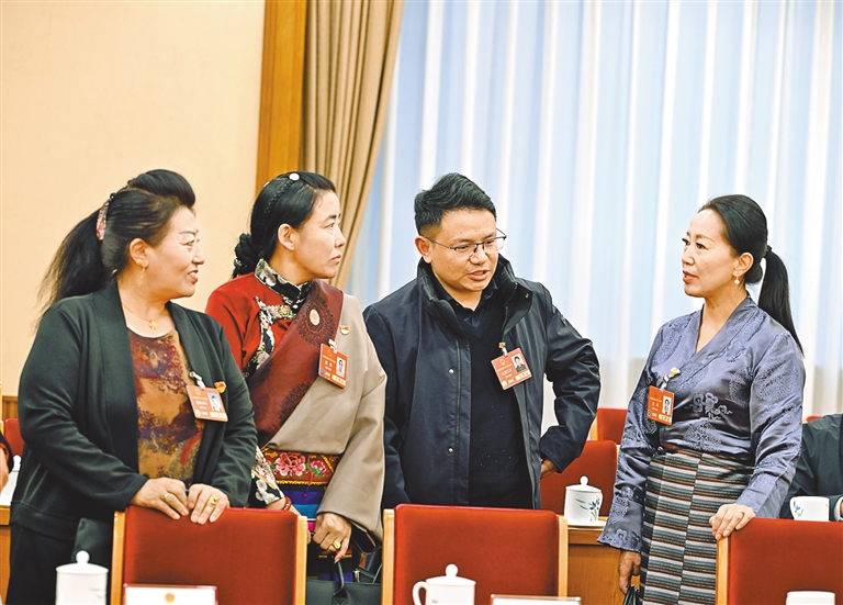 全國(guó)人大代表在會(huì)議間隙交流審議內(nèi)容。