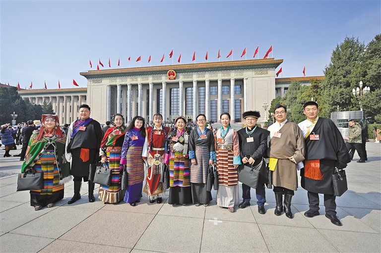 全國(guó)人大代表聆聽政府工作報(bào)告后,在人民大會(huì)堂前合影留念。記者 旦增西旦 攝