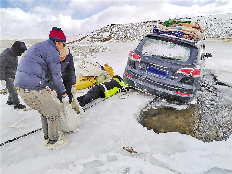 圖為聶榮縣公安局桑榮鄉(xiāng)派出所民警救助陷入結(jié)冰河道的車輛。圖/文 記者 萬靖