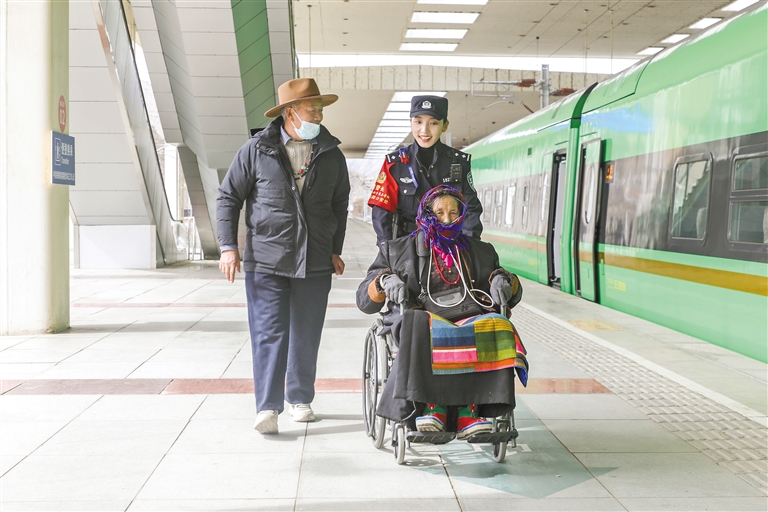 “格桑梅朵”女子乘務(wù)組乘警護(hù)送老年旅客安全乘車。