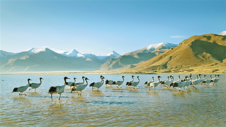 “在藏族文化中,黑頸鶴被視為仙鶴、神鳥和吉祥鳥,象征著吉祥、幸福和長壽。黑頸鶴選擇了我家門口這片土地作為越冬地,我有責任守護好這群高原精靈。黑頸鶴就像我的家人,我愛它們,所以我想保護它們,讓它們在這里能夠平安舒適地過冬?!绷种芸h春堆鄉(xiāng)卡東村62歲的旦增說。