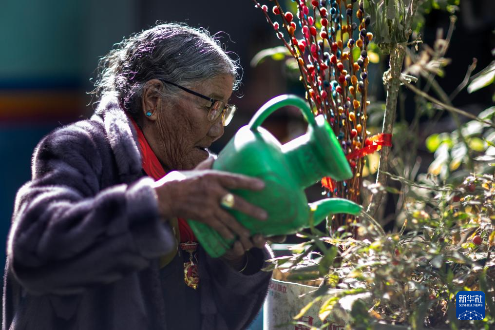 玉珍老人在家中澆花(3月17日攝)。新華社記者 姜帆 攝