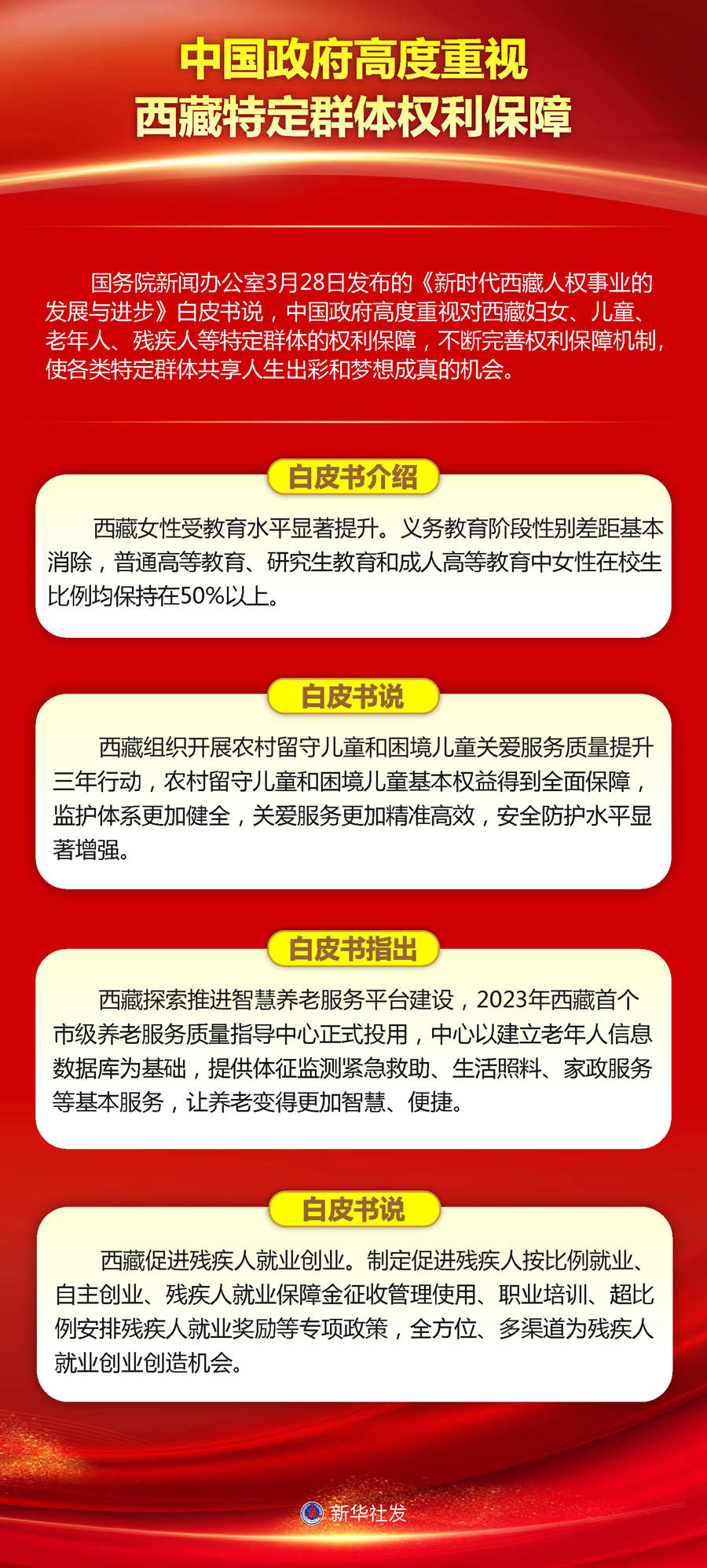 國務(wù)院新聞辦公室28日發(fā)布的《新時(shí)代西藏人權(quán)事業(yè)的發(fā)展與進(jìn)步》白皮書說,中國政府高度重視對西藏婦女、兒童、老年人、殘疾人等特定群體的權(quán)利保障,不斷完善權(quán)利保障機(jī)制,使各類特定群體共享人生出彩和夢想成真的機(jī)會(huì)。