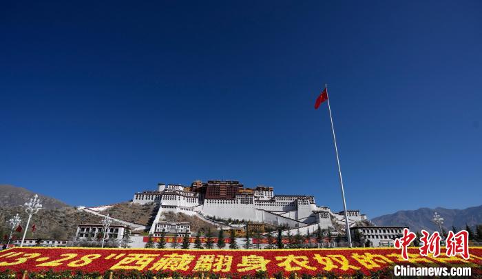 圖為3月28日,西藏布達(dá)拉宮廣場(chǎng)擺放西藏百萬(wàn)農(nóng)奴解放紀(jì)念日標(biāo)語(yǔ)。李林 攝