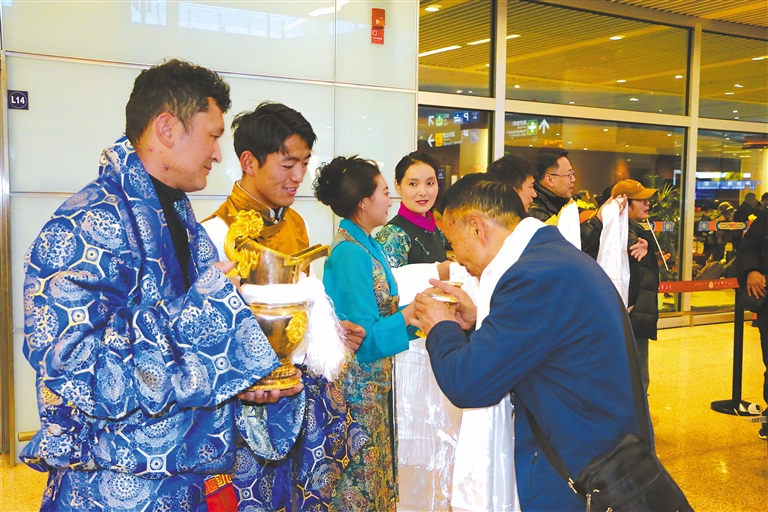 隨著西藏春季旅游的逐步復蘇,山南市文旅局工作人員身著節(jié)日盛裝,手捧哈達、切瑪盒、青稞酒,在拉薩貢嘎國際機場出站口迎接山南第一架旅游包機的游客。