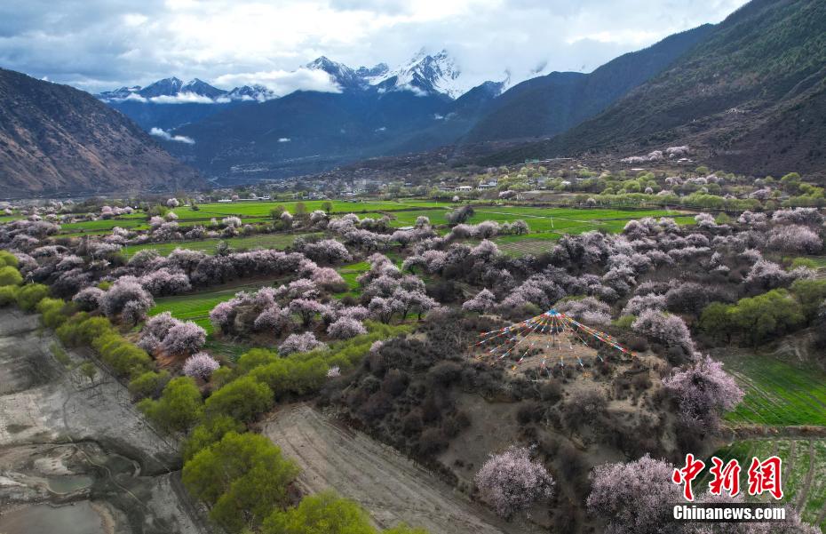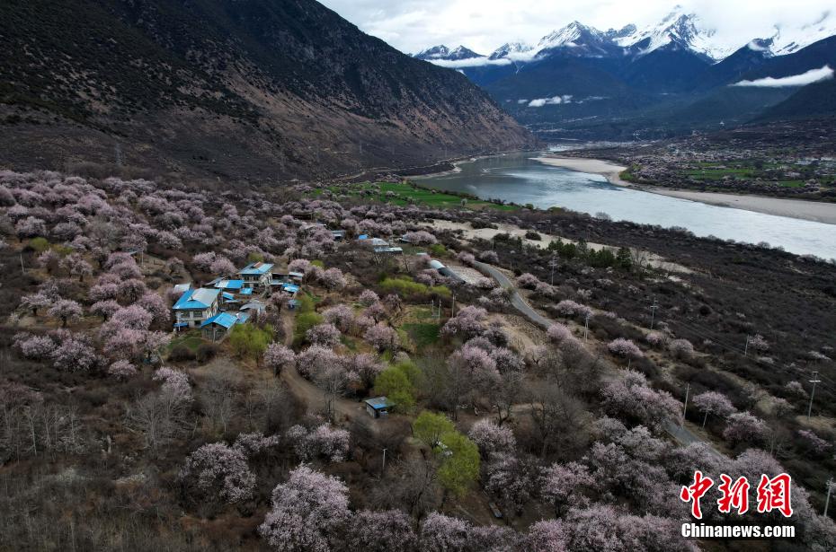4月4日,西藏林芝市雅魯藏布江沿線桃花風(fēng)光。每年3月下旬,西藏林芝雅魯藏布江沿線桃花綻放,與雪山、鄉(xiāng)村、田野共同組成高原獨(dú)特風(fēng)光,美不勝收。(無(wú)人機(jī)照片)