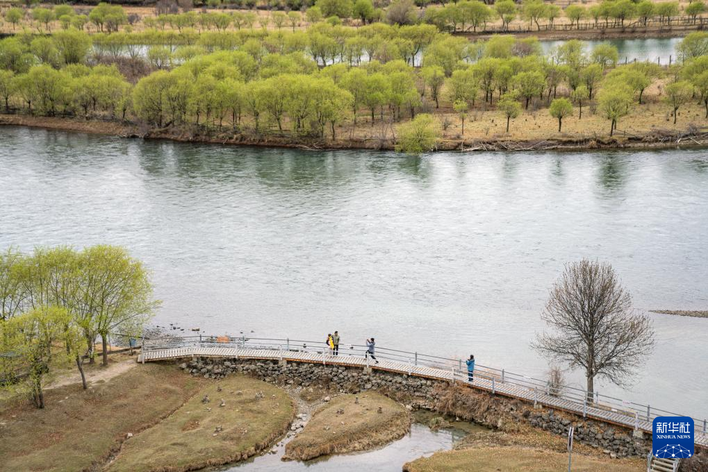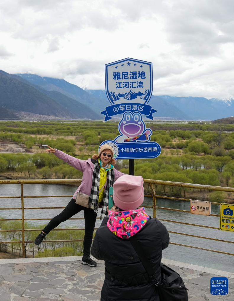 4月4日,游客在雅尼國(guó)家濕地公園觀景臺(tái)拍照打卡。新華社記者 晉美多吉 攝