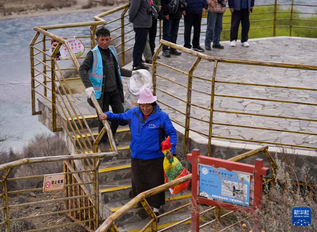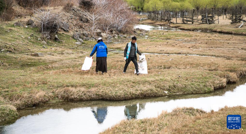 4月4日,雅尼國(guó)家濕地公園管護(hù)員在巡護(hù)途中清理垃圾。新華社記者 丁增尼達(dá) 攝