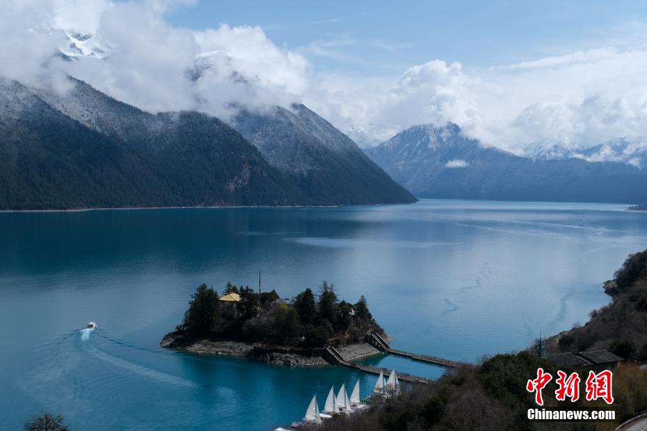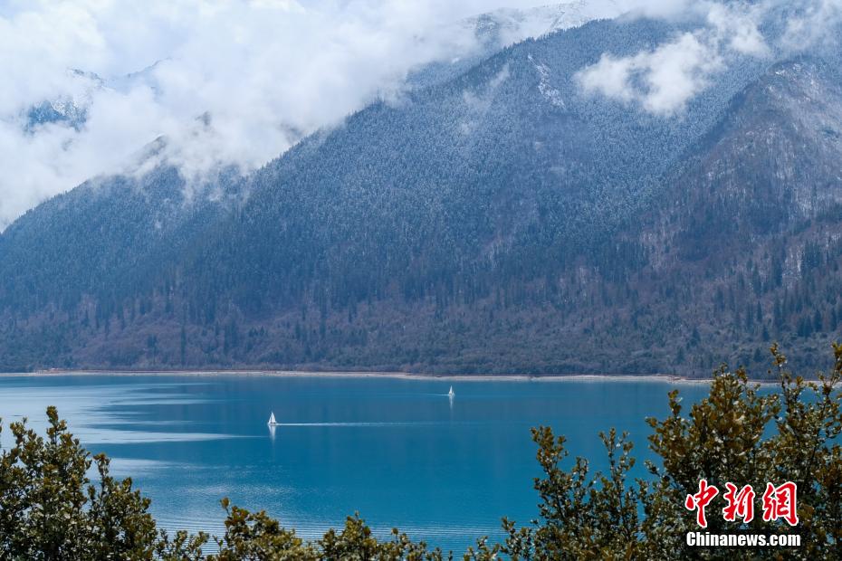 巴松錯(cuò)位于西藏林芝工布江達(dá)縣境內(nèi),地處巴河上游的高山峽谷中,是西藏首個(gè)自然風(fēng)景類國家5A級旅游景區(qū)。4月5日,巴松錯(cuò)迎來一場春雪,雪后四周原始森林猶如蒙上潔白面紗,湖面宛如一面藍(lán)寶石鑲嵌其中,風(fēng)光如畫。圖為4月5日,游客乘船游覽巴松錯(cuò)。中新社記者 江飛波 攝