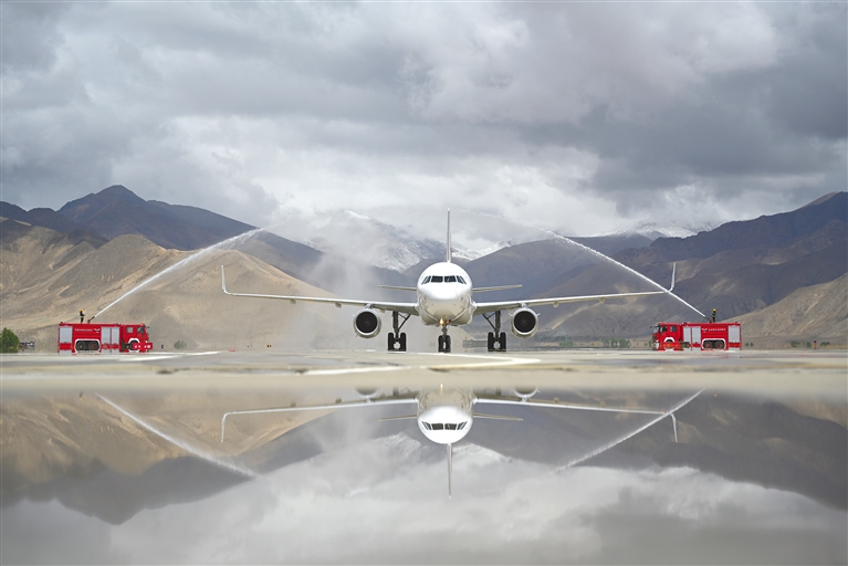 圖為5月1日,“上?!湛t”航線首航飛機(jī)在日喀則和平機(jī)場通過水門。記者 扎西頓珠 攝
