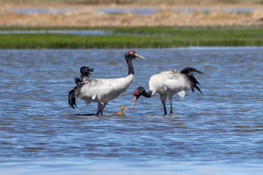 2024年6月9日,一對黑頸鶴帶著雛鳥在西藏那曲市申扎縣一處濕地棲息、覓食。新華社記者 旦增尼瑪曲珠 攝