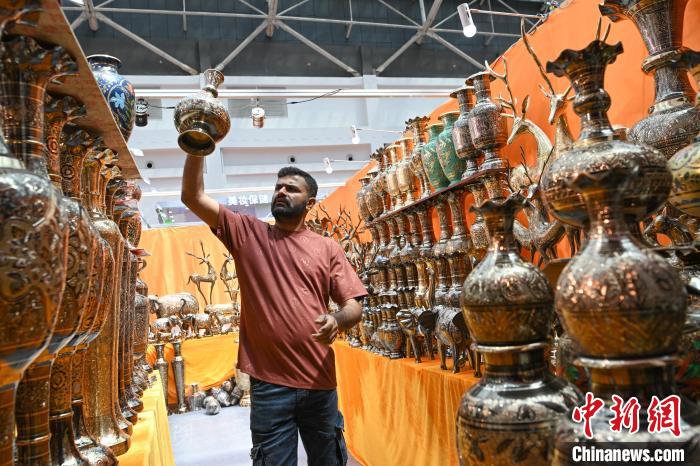 圖為拉薩進(jìn)口商品展覽會(huì)現(xiàn)場(chǎng),巴基斯坦商人在展會(huì)上擺放商品。中新社記者 貢嘎來松 攝