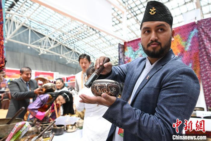 圖為拉薩進(jìn)口商品展覽會(huì)現(xiàn)場(chǎng),尼泊爾商人介紹、推銷自己的商品。中新社記者 貢嘎來松 攝