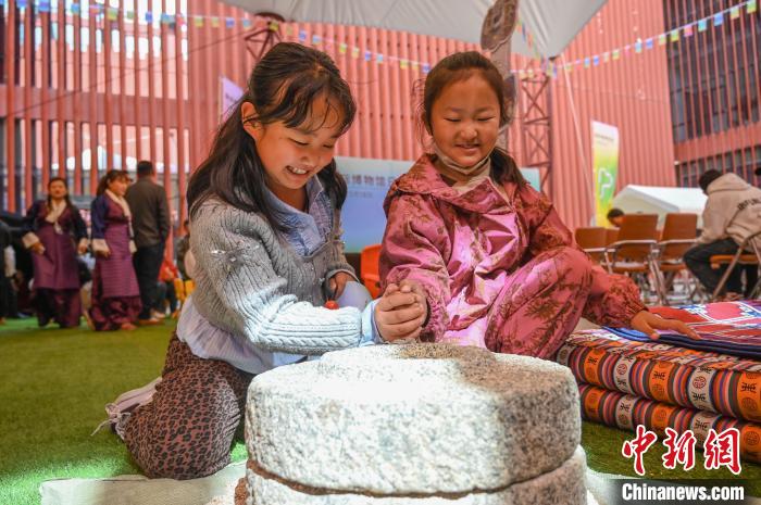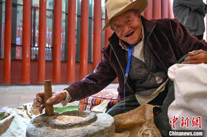 圖為市民體驗(yàn)手工磨糌粑。貢確 攝