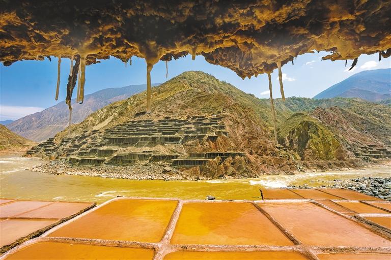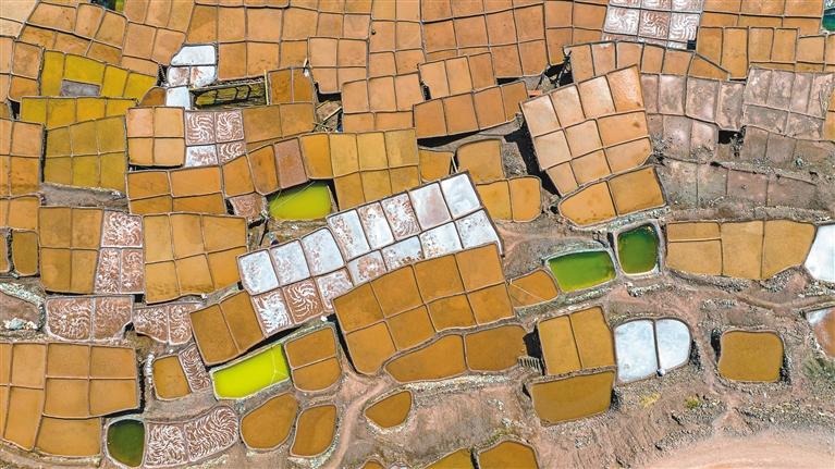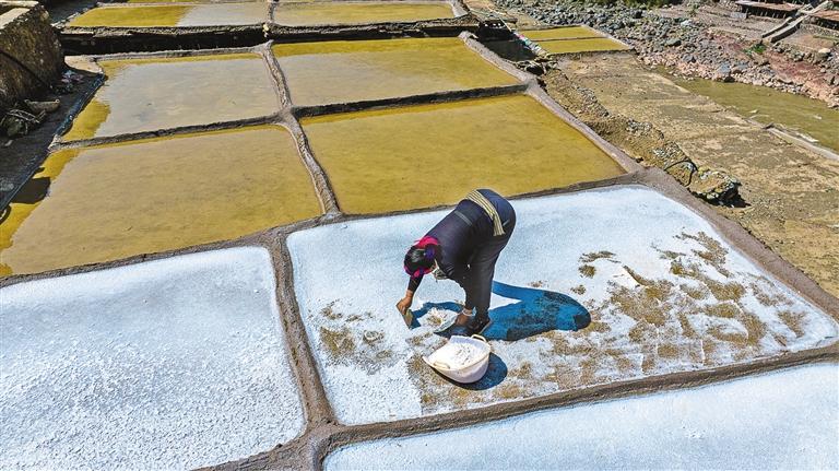 鹽田里,60歲的乃柯正和丈夫一起用木拍夯實(shí)鹽田?!艾F(xiàn)在用泵抽水輕松多了,但拍鹽田的手藝不能丟?!崩先说脑捳Z中,既有對科技的接納,也有對傳統(tǒng)的堅(jiān)守。鹽田下方,鹽晶垂落成簾,在山風(fēng)拂動下閃爍微光,仿佛在訴說著什么。一塊塊鹽田如同一面面鏡子,既映照出千年文明的厚重,也折射著鄉(xiāng)村振興的希望。當(dāng)鹽民們輕掃鹽田,他們掃的不僅是晶瑩的鹽,更是一份在傳承與創(chuàng)新中守護(hù)的鄉(xiāng)愁。