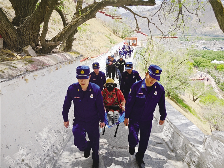 消防員扶著身體不適的游客參觀布達(dá)拉宮。