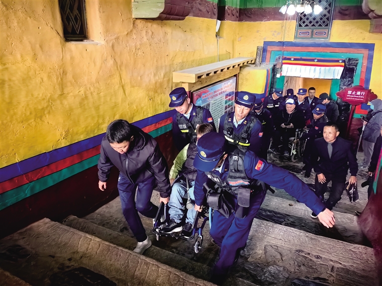 2024年,消防救援站接到一項(xiàng)特殊任務(wù)——幫助19名來(lái)自四川的殘疾人士參觀布達(dá)拉宮。面對(duì)15位肢體殘疾人和4位視力殘疾人,尤其是6位重度輪椅使用者和2位全盲者,消防員們沒(méi)有絲毫猶豫接下任務(wù)。布達(dá)拉宮海拔高、樓梯多、內(nèi)部道路狹窄陡峭,消防員們就用擔(dān)架抬、輪流背的方式帶領(lǐng)他們游覽。同時(shí),消防員化身“導(dǎo)游”,每到一處都詳細(xì)講解布達(dá)拉宮的歷史文化,耐心解答疑問(wèn),讓這些特殊游客感受到了溫暖與尊重。