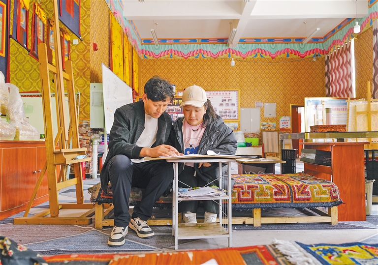 圖為昌都市察雅縣香堆鎮(zhèn)非遺扶貧就業(yè)工坊的匠人在指導(dǎo)學(xué)徒繪制唐卡。記者 丹增群培 攝