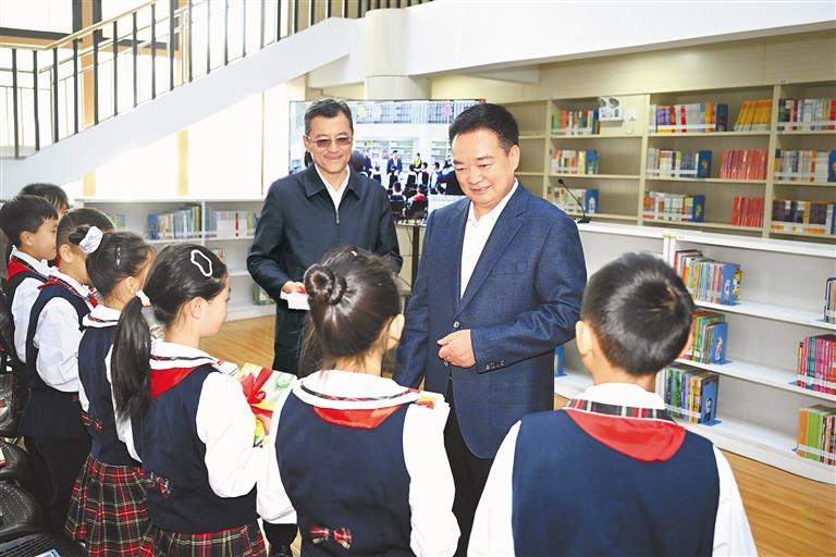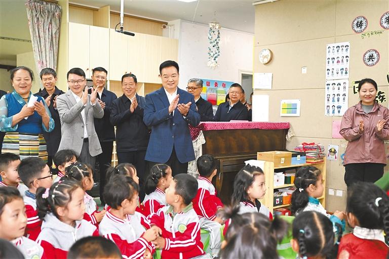 初夏,萬物并秀,生機勃發(fā),拉薩市實驗小學(xué)書聲瑯瑯。王君正走進校園,察看學(xué)校環(huán)境,參觀自然、閱讀、書法、體育等教育成果展示,了解學(xué)校歷史沿革、建設(shè)發(fā)展、教育教學(xué)等情況。他指出,習(xí)近平總書記高度重視、親切關(guān)懷少年兒童和少先隊工作,多次參加少先隊活動,發(fā)表重要講話、作出重要指示。5月27日,習(xí)近平總書記致信祝賀中國少年先鋒隊第九次全國代表大會召開,殷切寄語廣大少年兒童,飽含著對大家的深切關(guān)愛。要加強愛國主義教育,講好思政課,著力講好黨的故事、革命的故事、英雄的故事,時刻把祖國和人民放在心中,不忘初心、童心向黨,從小聽黨話、感黨恩、跟黨走;要積極推廣國家通用語言文字,把鑄牢中華民族共同體意識根植少年兒童心靈深處,引導(dǎo)他們爭做民族團結(jié)的小石榴籽,爭當(dāng)學(xué)習(xí)和踐行社會主義核心價值觀的小模范。圖書館內(nèi),“紅領(lǐng)巾小書蟲”讀書分享活動正在進行,孩子們圍坐在一起,與定日縣長所鄉(xiāng)完全小學(xué)學(xué)生視頻連線,共同分享喜歡的書籍,王君正認(rèn)真傾聽、親切詢問,向孩子們贈送書籍。“祖國的未來和希望在你們身上,要熱愛祖國、好好學(xué)習(xí)、天天向上,從小培養(yǎng)良好的道德情操?!蓖蹙膭钏麄冋f,要多讀書、讀好書,從書中汲取智慧和營養(yǎng),將來做對國家、對人民、對社會有用的人。