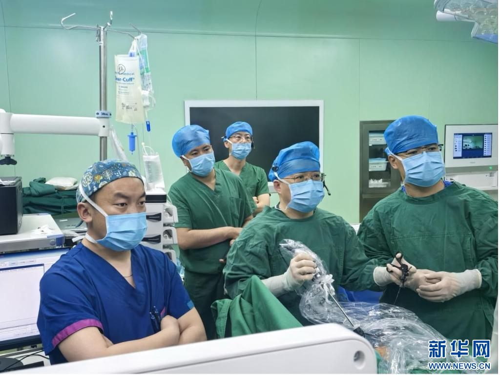 6月6日,黃金獅教授(第一排中間)和趙勇主治醫(yī)師(第一排右側)在為先天性食管閉鎖患兒行胸腔鏡下食管閉鎖吻合術。(受訪者供圖)