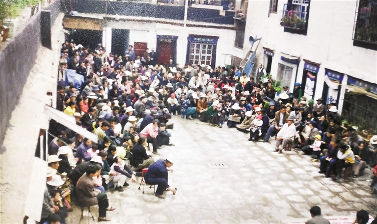 在當(dāng)時(shí)拍的另一張照片上,幾十位居民擠在過道里準(zhǔn)備投票?!澳菚r(shí)候院子小,選舉時(shí)得側(cè)著身子站?!钡录扛禄貞浀溃霸鹤诱?,雨天積水,但絲毫不影響大家參與社區(qū)事務(wù)的熱情?!闭掌囊唤?,13歲的普布普赤正躲在母親身后好奇張望,如今她41歲,已成長(zhǎng)為大院的戶長(zhǎng)。