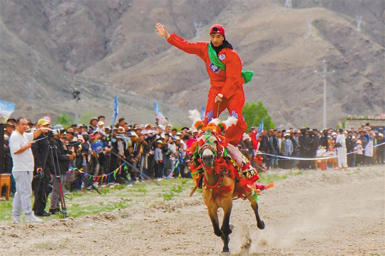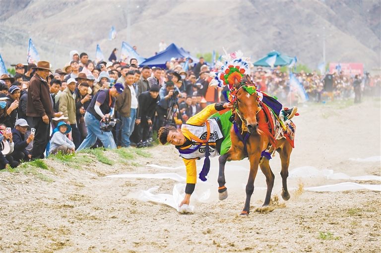 賽馬項(xiàng)目展示了非遺馬具、200米馬術(shù)比賽、短途沖刺賽、趣味挑戰(zhàn)賽等。騎手們緊握韁繩,揮舞著馬鞭,馬匹如離弦之箭飛馳而出,每一個(gè)高難度動(dòng)作,都讓觀眾心跳加速、熱血沸騰。