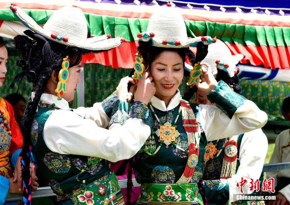 6月28日,拉薩首屆林卡囊瑪堆諧大賽在達孜區(qū)舉辦。現場,經過前期海選入圍的19支隊伍依次上臺競技。囊瑪和堆諧,合稱囊瑪堆諧,是西藏民間歌舞發(fā)展到較高層次、集歌舞樂為一體的珍貴傳統文化藝術遺產,深受當地民眾的喜愛與追捧。圖為首屆林卡囊瑪堆諧大賽比賽現場,參賽隊伍正在整理妝容。