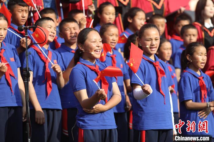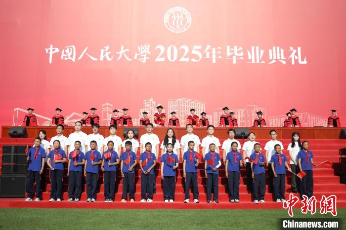 6月23日,中國(guó)人民大學(xué)2025年畢業(yè)典禮現(xiàn)場(chǎng),措果鄉(xiāng)中心小學(xué)的孩子們與人大畢業(yè)生們小手牽大手,相伴而立,共同唱響《萬疆》。主辦方供圖