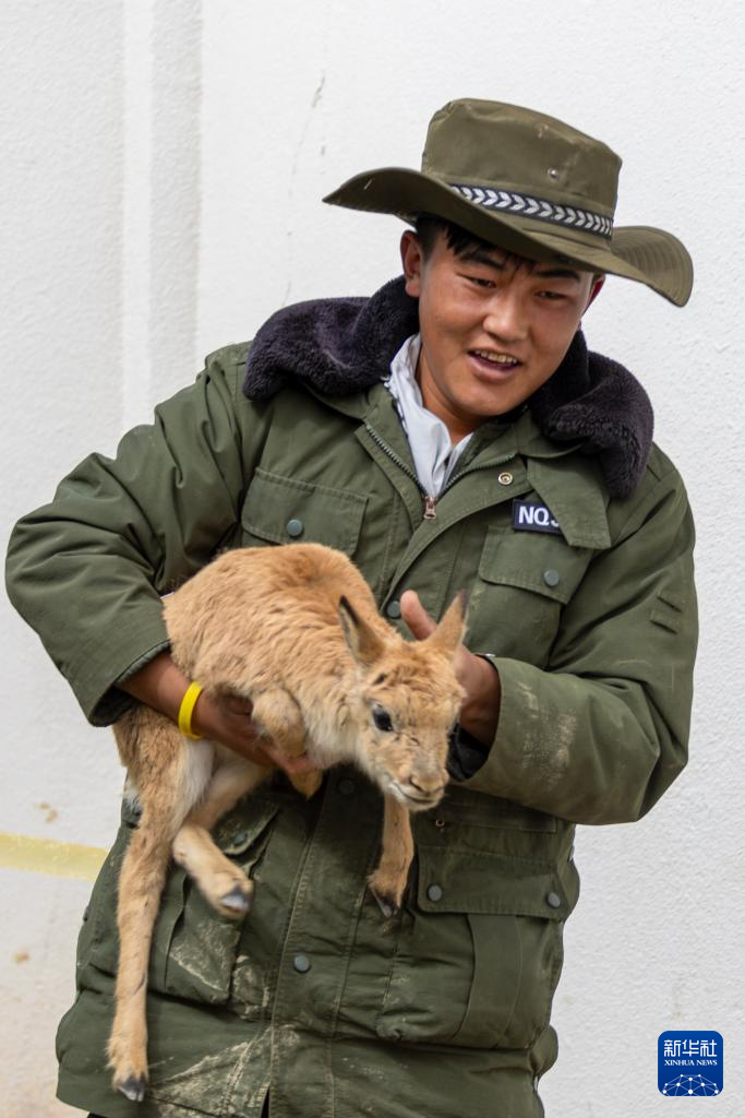 措羅木管理站站長(zhǎng)阿旺洛卓在給藏羚羊幼崽喂奶(7月16日攝)。新華社記者 姜帆 攝?