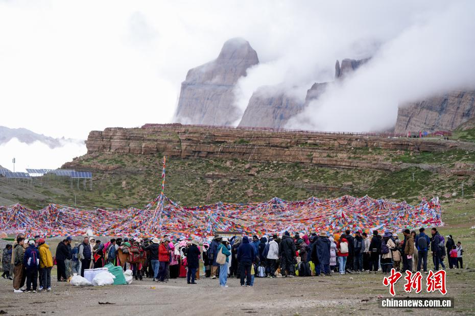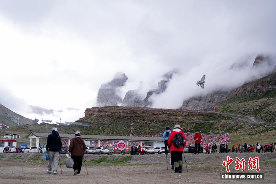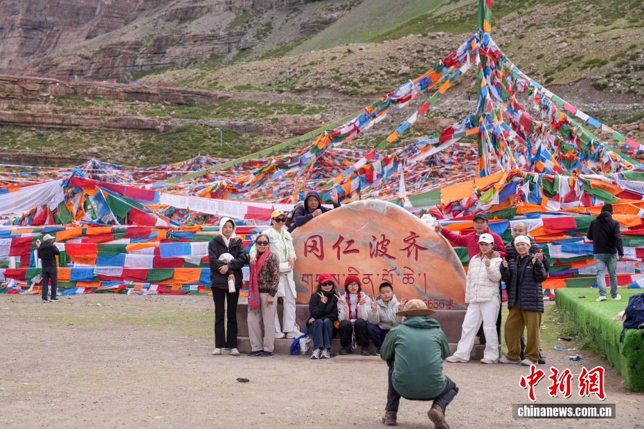 7月21日,游客在岡仁波齊山腳下的經(jīng)幡廣場打卡拍照。岡仁波齊位于西藏阿里地區(qū)普蘭縣境內(nèi),是岡底斯山的主峰,也是藏傳佛教的神山之一,每年吸引眾多信徒前往轉(zhuǎn)山,并衍生出徒步旅行的經(jīng)典路線。每年來自國內(nèi)外的徒步旅行者為當?shù)貏?chuàng)造就業(yè)機會的同時,也推動了文旅產(chǎn)業(yè)的發(fā)展。中新社記者 張祥毅 攝