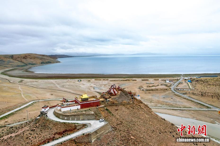 7月22日,從吉吾寺上空航拍瑪旁雍錯(cuò)。瑪旁雍錯(cuò)與拉昂錯(cuò)位于西藏阿里地區(qū)普蘭縣境內(nèi),兩湖僅有一堤之隔,卻擁有不同的地理特征和咸淡水之分,因而分別被譽(yù)為“圣湖”與“鬼湖”。(無(wú)人機(jī)照片)中新社記者 張祥毅 攝