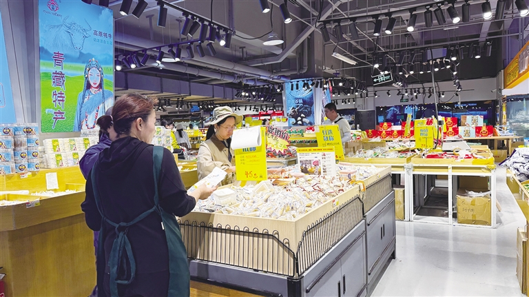 除了家電賣場(chǎng),特產(chǎn)超市也迎來了消費(fèi)熱潮。在位于拉薩市濱河路乃倉(cāng)廣場(chǎng)負(fù)一樓的藏匯倉(cāng)·西藏特產(chǎn)倉(cāng)儲(chǔ)超市(乃倉(cāng)總店),前來選購(gòu)特產(chǎn)的消費(fèi)者絡(luò)繹不絕,貨架前時(shí)常排起長(zhǎng)隊(duì)。該超市負(fù)責(zé)人李紅容笑著說:“今年上半年的客流量和銷售額都比去年同期上漲了不少,像牦牛肉干、藏香、青稞制品這些特色產(chǎn)品特別受歡迎。一方面是本地市民買回去自己吃或者送給外地朋友;另一方面很多游客也會(huì)專門過來采購(gòu),把西藏的味道帶回去?,F(xiàn)在物流方便,我們還開通了快遞直發(fā)服務(wù),不少消費(fèi)者在線上下單,店里的線上訂單量每個(gè)月都在增加。為了滿足消費(fèi)者需求,我們還增加了產(chǎn)品種類,光是青稞制品就有青稞餅干、青稞麥片、青稞酒等二十多個(gè)品種。”