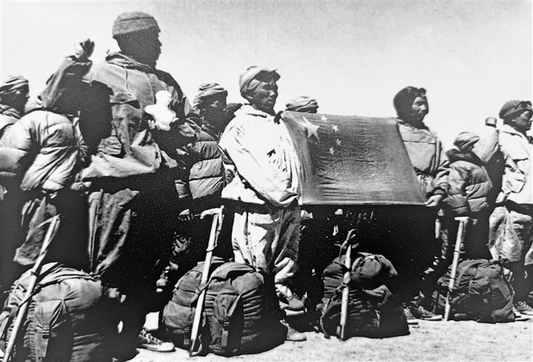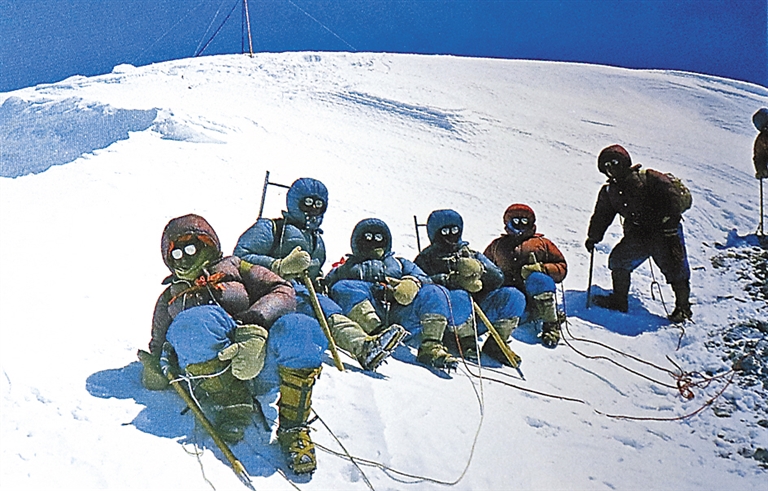 據(jù)羅則介紹,50年前,“九勇士”成功從北坡登頂珠峰之后,隨即開(kāi)展了向黨和人民匯報(bào)勝利的喜訊、豎立金屬覘標(biāo)測(cè)量珠峰高度、展示五星紅旗、拍攝在頂峰活動(dòng)資料、搜集山頂冰雪樣品、遙測(cè)地球最高點(diǎn)上的人類心電圖、測(cè)量峰頂上的覆雪深度、采集峰頂花崗巖石標(biāo)本、拍攝頂峰全景的電影、把毛主席石膏塑像安放在峰頂上、為登頂勇士拍攝紀(jì)念照片11項(xiàng)工作。