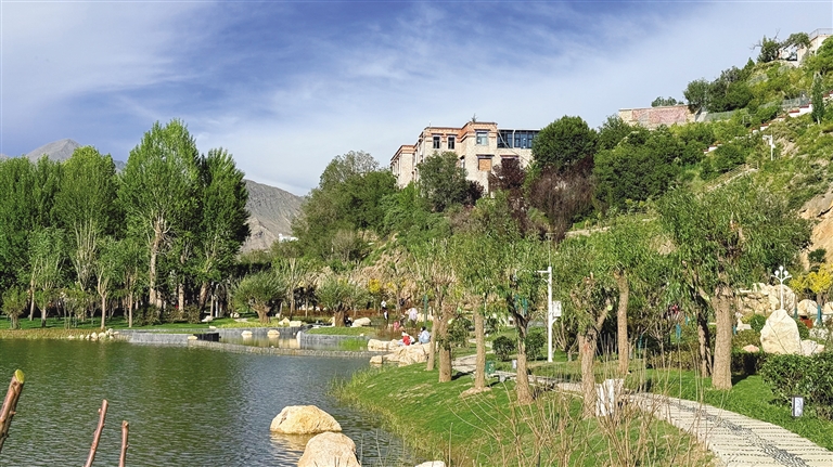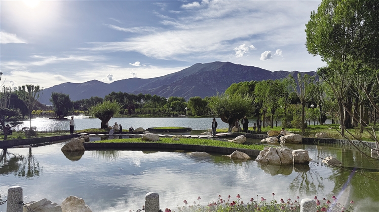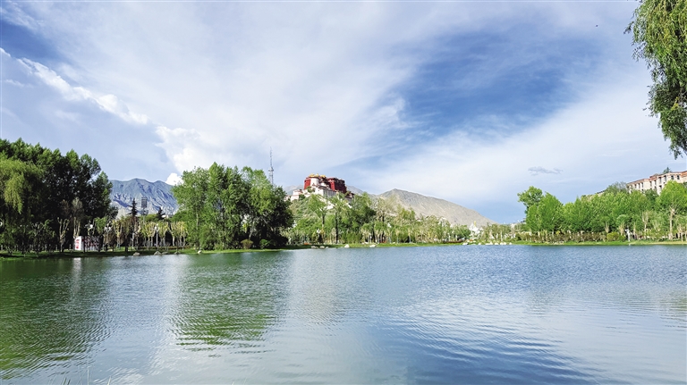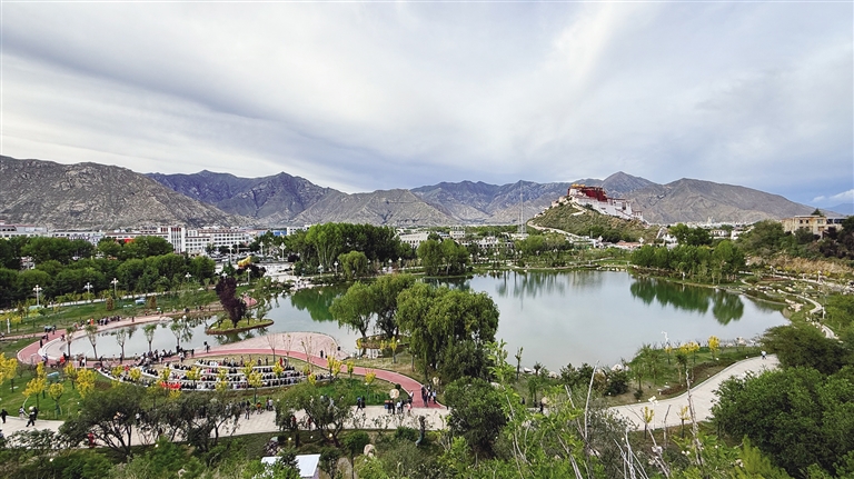 拉薩團結(jié)公園坐落于布達拉宮西麓、藥王山腳下。昔日,這里房屋高低錯雜、線纜交錯密布、市場喧鬧擁擠、環(huán)境喧囂擾攘,不僅影響城市形象和生態(tài)環(huán)境,還影響出行游玩體驗。如今,湖水如碧綢般清澈,岸邊綠樹成蔭,各類花卉競相綻放,昔日雜亂之地已蛻變?yōu)轸浯涿髦?,人文古跡與自然景致相映成趣,共同繪就出“百澤繞城·水城相依”的生態(tài)文明畫卷。