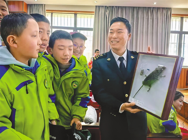 “同學們,這個圓柱形的赤褐色小蟲子,大家知道是什么嗎?它可是木材的‘隱形殺手’……”近期,在拉薩市第七中學課堂上,海關關員通過實物標本展示,向120余名師生生動講解檢疫性有害生物雙鉤異翅長蠹的危害?;顒蝇F(xiàn)場,海關關員通過展示外來入侵物種標本、講解“異寵”及外來物種入侵危害知識,幫助同學們了解《中華人民共和國生物安全法》等相關法律法規(guī),引導青少年樹立生物安全意識,積極守護生態(tài)安全。