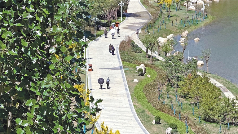 如今,湖水如碧綢般清澈,岸邊綠樹(shù)成蔭,各類(lèi)花卉競(jìng)相綻放。昔日雜亂之地已蛻變?yōu)榫用裥蓍e納涼的好去處。人文古跡與自然景致相映成趣,共同繪就出“百澤繞城·水城相依”的生態(tài)文明畫(huà)卷。