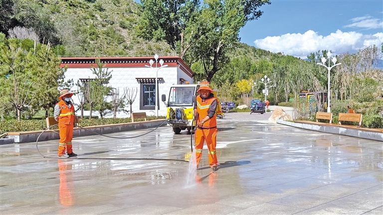 拉薩市環(huán)衛(wèi)部門(mén)工作人員保障公園干凈整潔。