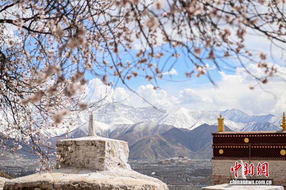 位于西藏拉薩北部山坳里的古剎帕邦喀周圍桃花盛開,吸引眾多游客前來觀光拍照。圖為帕邦喀周圍盛開的桃花和遠(yuǎn)處的布達(dá)拉宮。中新社記者 貢嘎來松 攝