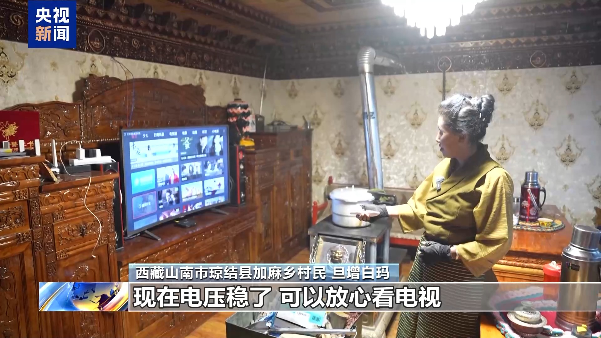 西藏山南瓊結(jié)縣加麻鄉(xiāng)村民 旦增白瑪:現(xiàn)在電壓穩(wěn)了,可以放心看電視。而且還買了很多新家電,冰箱、洗衣機。