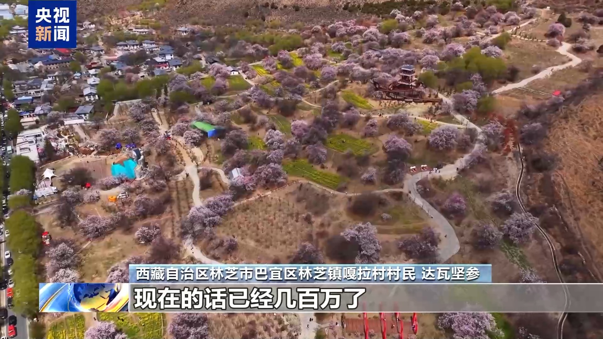 西藏自治區(qū)林芝市巴宜區(qū)林芝鎮(zhèn)嘎拉村村民 達(dá)瓦堅參:以前從桃花節(jié)開始搞起來的時候,全村收入幾百塊錢到幾千塊錢到幾萬塊錢,現(xiàn)在的話已經(jīng)幾百萬了。
