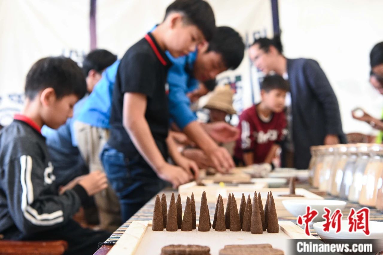 圖為2019年7月6日,來自江蘇蘇州的小游客們在德吉藏家體驗藏香手作。中新社記者 何蓬磊 攝