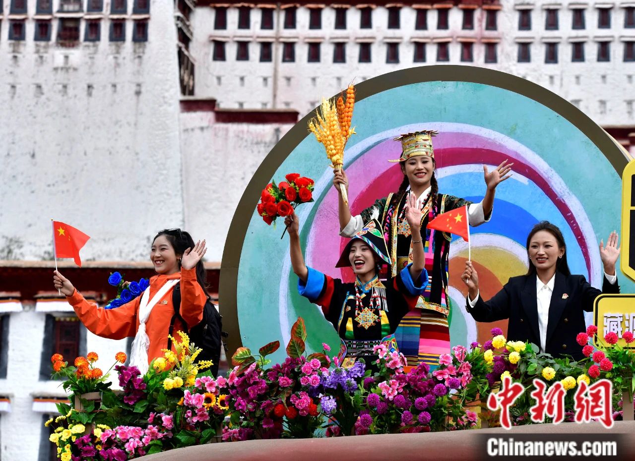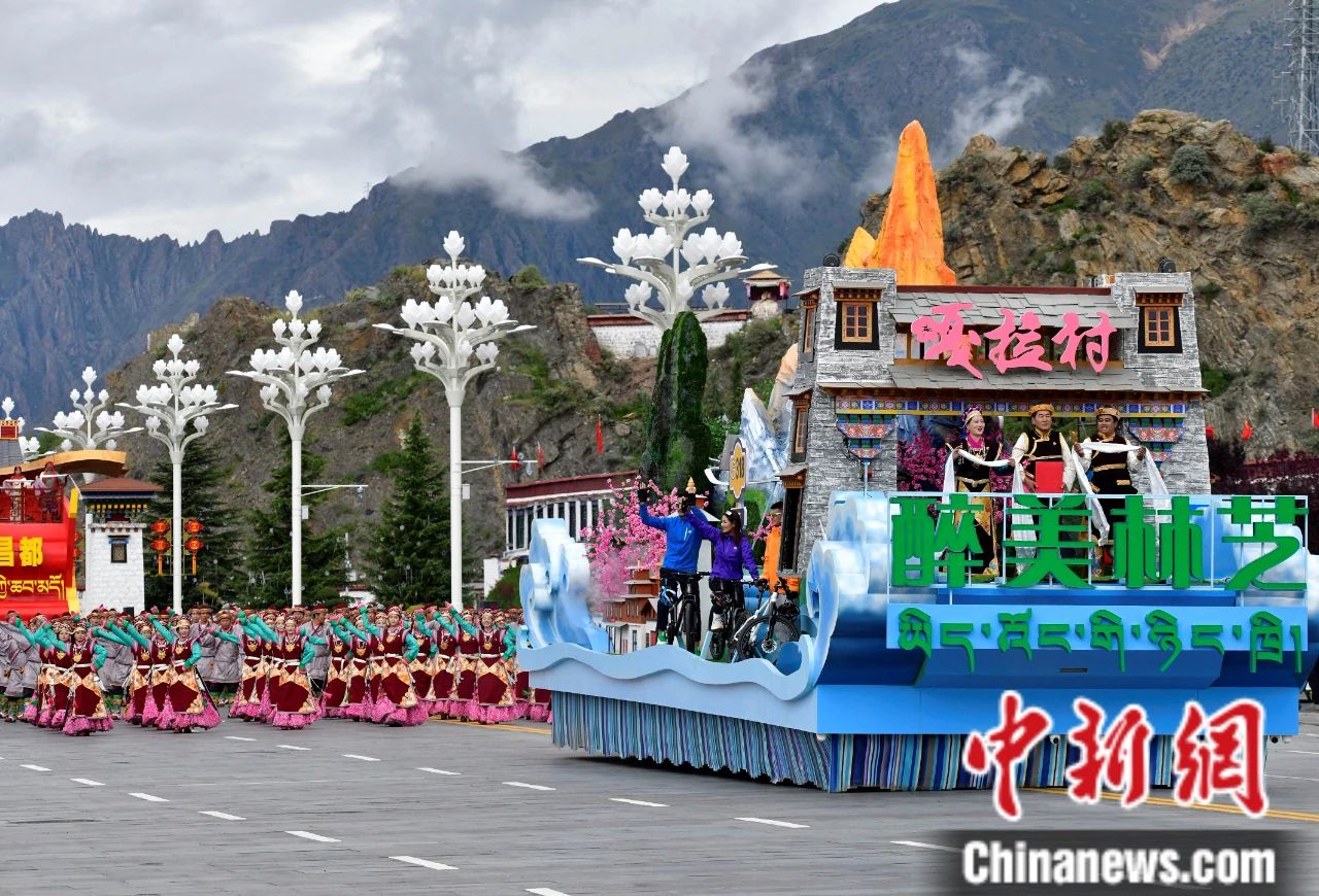 圖為西藏自治區(qū)成立60周年慶祝大會中的林芝彩車方隊。中新社記者 李林 攝