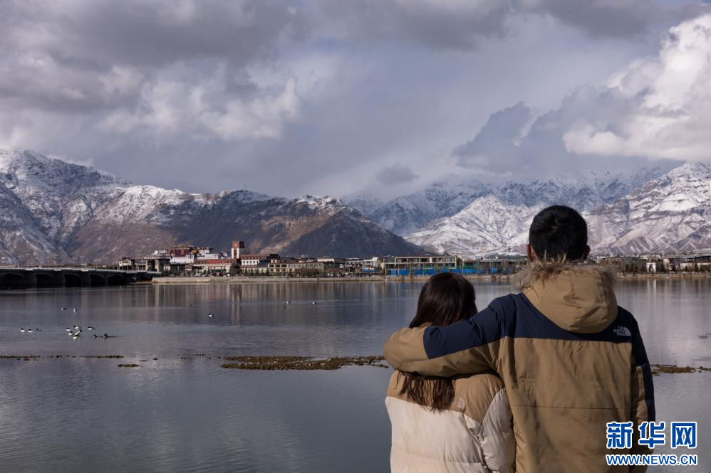 1月18日,游客在拉薩河邊觀賞雪景。新華網發(fā) 李騰 攝