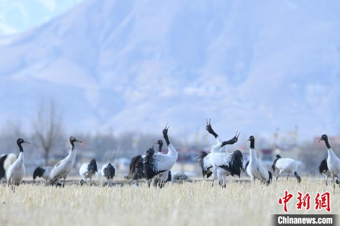 圖為拉薩林周縣黑頸鶴保護(hù)區(qū)內(nèi),黑頸鶴正在覓食、嬉戲。貢嘎來松 攝