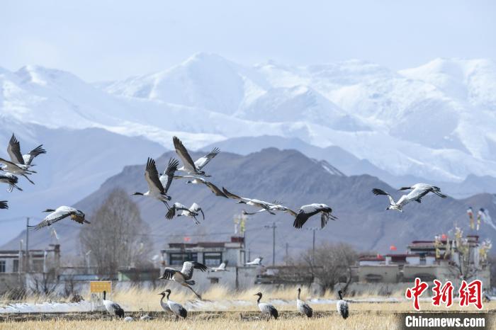 圖為拉薩林周縣黑頸鶴保護(hù)區(qū)內(nèi),黑頸鶴在雪山翱翔。貢嘎來松 攝