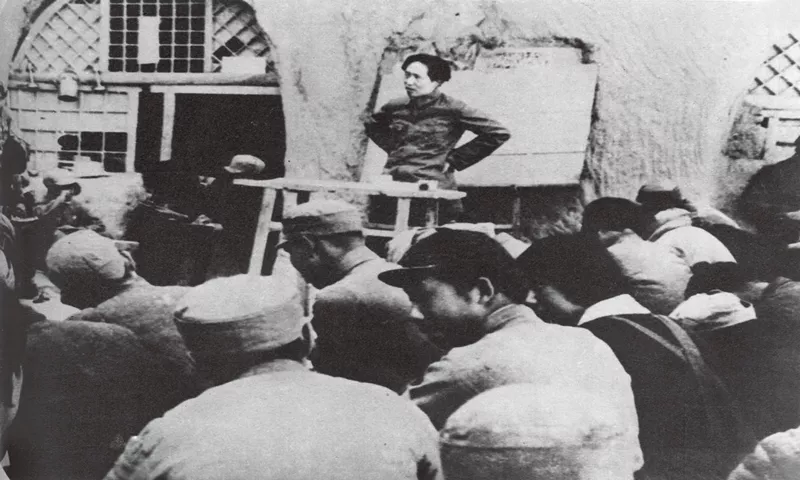 毛澤東非常重視理論聯(lián)系實際這一馬克思主義學風的養(yǎng)成,強調必須始終堅持把馬克思主義與中國實際緊密結合起來。圖為毛澤東在為陜北公學學員講課。